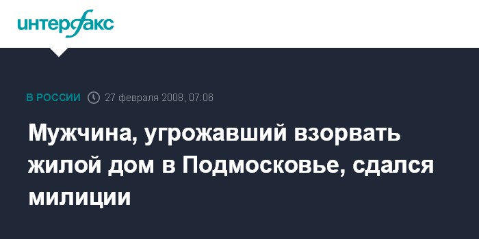 Москва. 27 февраля. INTERFAX.RU - Мужчина, угрожавший взорвать жилой дом в поселке Первомайский Коломенского района Московской области, сдался милиционерам около 3:00 мск.