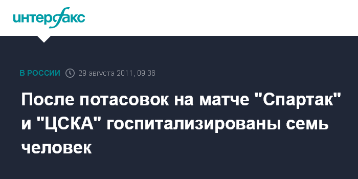 Москва. 29 августа. INTERFAX.RU - Семь человек госпитализированы после футбольного матча между московскими клубами "Спартак" и "ЦСКА", сообщил "Интерфаксу" источник в медицинских кругах столицы. По его словам, в общей сложности за медицинской помощью на стадионе "Лужники" обратились 23 человека.