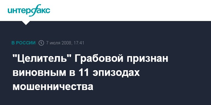 Москва. 7 июля. INTERFAX.RU - Таганский суд Москвы признал "целителя" Григория Грабового виновным в 11 эпизодах мошенничества. "Суд установил, что Грабовой совершил 11 эпизодов мошенничества", - сказала судья, оглашая приговор.