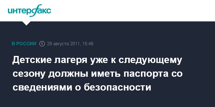 Москва. 29 августа. INTERFAX.RU - Уполномоченный по правам ребенка при президенте РФ Павел Астахов предлагает разработать паспорт безопасности для всех детских лагерей.