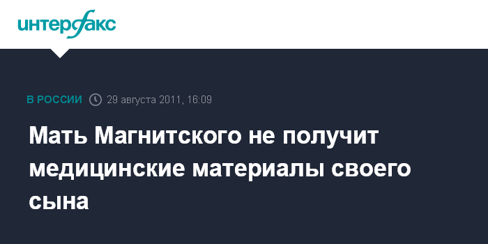 Москва. 29 августа. INTERFAX.RU - Мосгорсуд признал законным отказ предоставить матери скончавшегося в СИЗО юриста фонда Hermitage Capital Сергея Магнитского медицинские материалы для проведения независимой экспертизы его гибели