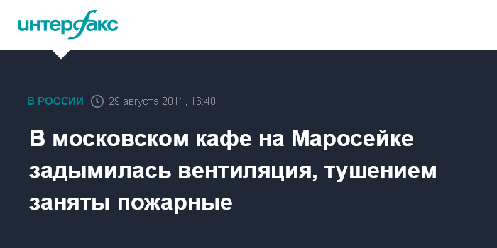 Москва. 29 августа. ИНТЕРФАКС - Возгорание произошло в системе вентиляции кафе "Этаж" в центре Москвы, сообщил "Интерфаксу" источник в правоохранительных органах.