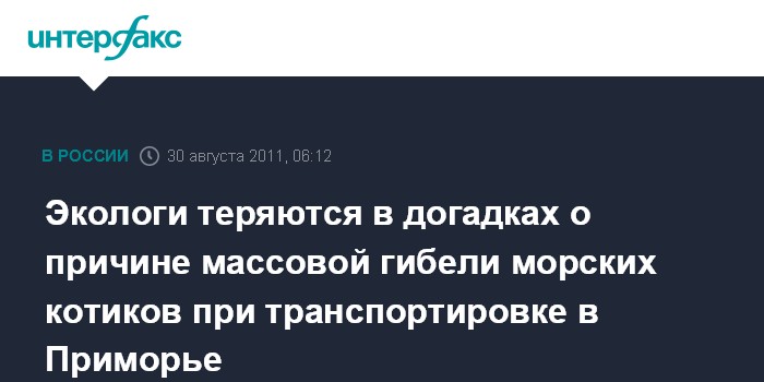Владивосток. 30 августа. ИНТЕРФАКС-ДАЛЬНИЙ ВОСТОК - Ученые-экологи Дальнего Востока отмечают незаурядную выносливость морских котиков к различным трудным условиям, но пока не могут с уверенностью сказать, что могло стать причиной гибели 12 этих животных при транспортировке самолетом из Южно-Сахалинска во Владивосток.