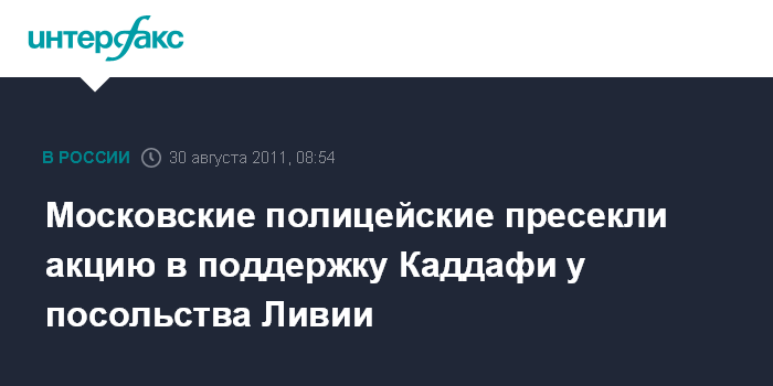 Москва. 30 августа. INTERFAX.RU - Девять человек попытались провести несогласованную акцию у посольства Ливии в Москве в поддержку президента Муаммара Каддафи. "Участники пикета держали в руках национальный флаг Ливии и выкрикивали лозунги на английском языке", - сообщил источник в правоохранительных органах "Интерфаксу" во вторник.