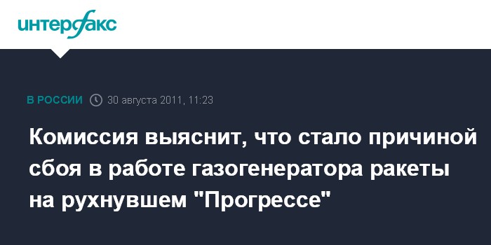 Москва. 30 августа. INTERFAX.RU - Комиссии по расследованию причин аварийного запуска грузового космического корабля "Прогресс М-12М" пока не удалось установить причину нештатной работы газогенератора 3-й ступени ракеты-носителя "Союз-У", приведшую к падению грузового корабля, сообщил "Интерфаксу-АВН" в понедельник источник в комиссии.