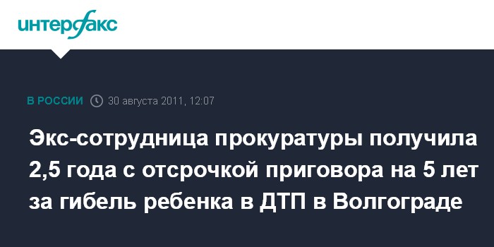 Бывший прокурор отдела по надзору за уголовно-процессуальной и оперативно-розыскной деятельностью областной прокуратуры Елена Иванова признана виновной по части 3 статьи 264 УК РФ (нарушение правил дорожного движения, повлекшее смерть человека) и приговорена к 2,5 годам лишения свободы с отсрочкой приговора на 5 лет до достижения ее дочерью 14 лет.