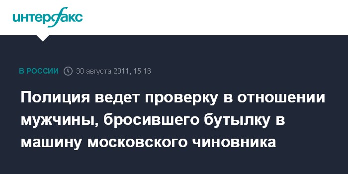 Москва. 30 августа. INTERFAX.RU - Решается вопрос о возбуждении уголовного дела в отношении мужчины, бросившего бутылку в автомобиль, принадлежащий одному из чиновников московской мэрии, сообщили "Интерфаксу" в пресс-службе ГУ МВД России по Москве.