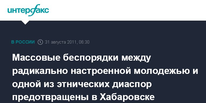 Хабаровск. 31 августа. ИНТЕРФАКС - ДАЛЬНИЙ ВОСТОК - В Хабаровске предотвращен конфликт между участниками радикально настроенной молодежи и представителями одной из этнических диаспор.