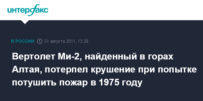 "31 августа возле правого притока реки Большая Чили в Улаганском районе Республики Алтай были обнаружены обломки вертолета Ми-2. Доследственная проверка показала, что 10 июля 1975 года этот вертолет вылетел на тушение пожара", - сказала Капич в среду агентству "Интерфакс-Сибирь".
