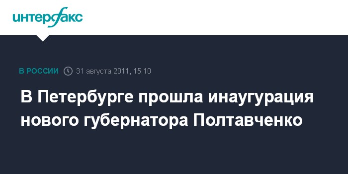 Санкт-Петербург. 31 августа. INTERFAX.RU - Георгий Полтавченко официально вступил в должность губернатора Санкт-Петербурга после процедуры инаугурации, передал корреспондент "Интерфакса". Инаугурация прошла в Мариинском дворце в среду после того, как Законодательное собрание утвердило Г.Полтавченко в должности по представлению президента РФ.