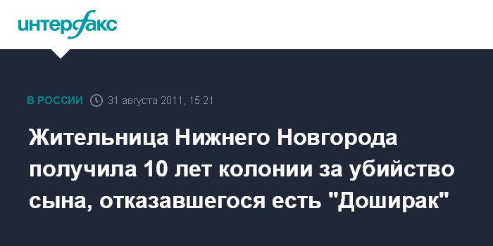 Нижний Новгород. 31 августа. INTERFAX.RU - Сормовский районный суд Нижнего Новгорода в среду вынес приговор 36-летней местной жительнице, обвиняемой в убийстве сына, который не захотел ужинать лапшой быстрого приготовления.