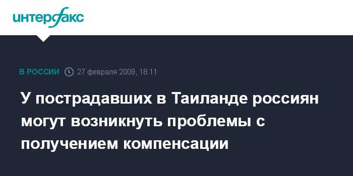 Москва. 27 февраля. INTERFAX.RU - У российских туристов, пострадавших в автоаварии в Таиланде, могут возникнуть серьезные проблемы с получением материальной компенсации за причиненный вред их здоровью, сообщил начальник правового управления Федерального агентства по туризму РФ Евгений Писаревский.