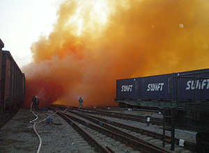 Челябинск. 1 сентября. INTERFAX.RU - В районе железнодорожного вокзала в Челябинске загорелась цистерна с бромом. Как сообщили агентству "Интерфакс-Урал" очевидцы, в районе вокзала наблюдалось сильное задымление. Позднее стало известно, что в вагоне грузового состава на железнодорожной станции в Челябинске в четверг разлились емкости с бромом. Из-за ЧП состав был отбуксирован на безопасное расстояние от станции. "От диспетчера в МЧС поступило сообщение о разливе ядовитого вещества, однако оказалось, что в грузовом составе разлились порядка 8-10 емкостей с бромом по 5 литров каждая. На место прибыло подразделение пожарной части, они провели частичную дезактивацию - засыпали вещество песком и остудили пеной", - сообщил агентству "Интерфакс-Урал" руководитель пресс-службы Уральского регионального центра МЧС РФ Вадим Гребенников. "Угрозы населению или прилегающей местности бром не представляет. Эвакуация не проводилась", - подчеркнул собеседник агентства. По его словам, груз брома предназначался для химпредприятия и следовал на Алтай. Сейчас груз привозят в должное состояние. Задержек поездов нет.