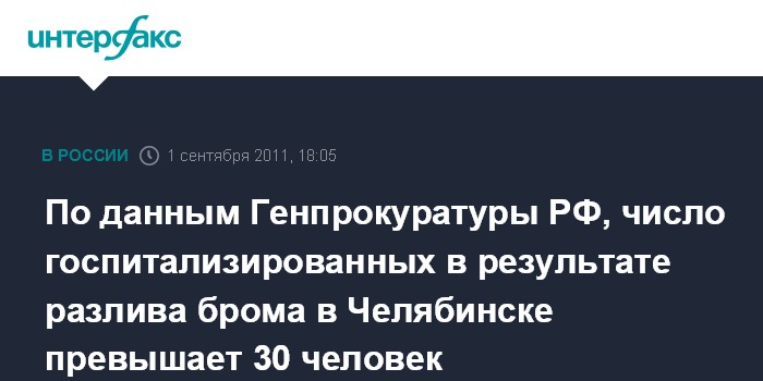 Москва. 1 сентября. INTERFAX.RU - Госпитализировано 33 человека, пострадавших в результате разлива брома на железнодорожном вокзале Челябинска, сообщили в Генпрокуратуре РФ.