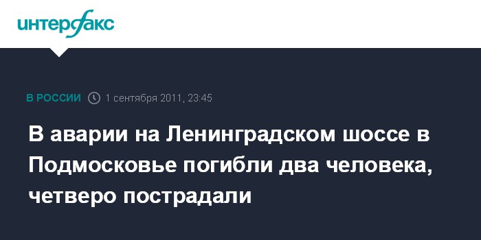 Москва. 1 сентября. ИНТЕРФАКС – Два человека погибли и еще четверо получили ранения в ДТП на Ленинградском шоссе в Подмосковье, сообщил "Интерфаксу" в четверг источник в правоохранительных органах.