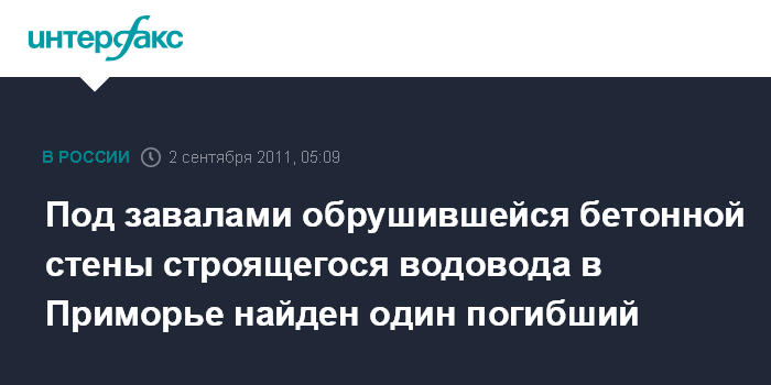 Как сообщалось, в пятницу утром на стройке водовода "Пушкинская депрессия" в Приморья рухнула бетонная стена. Под завалами оказались несколько рабочих. Четверо из них доставлены в больницу.