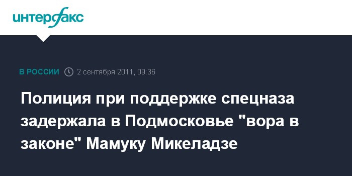 Москва. 2 сентября. INTERFAX.RU - Крупный "вор в законе" Мамука Микеладзе был при поддержке спецназа задержан в среду в Подмосковье, сообщил "Интерфаксу" источник в правоохранительных органах.