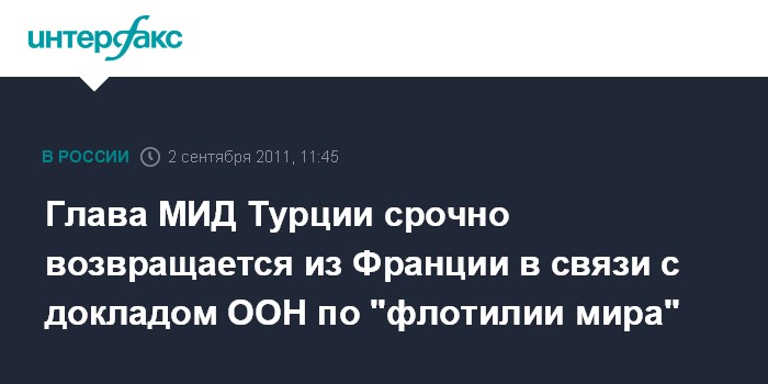 Иерусалим. 2 сентября. INTERFAX.RU - Глава МИД Турции Ахмет Давутоглу прервал визит во Францию и вылетел на родину, чтобы подготовить официальный ответ на доклад ООН о нападении на "флотилию мира" в мае 2010 года, сообщает в пятницу израильская пресса.