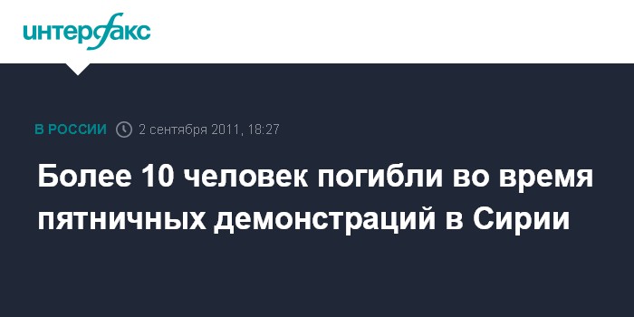 Дубай. 2 сентября. INTERFAX.RU - По меньшей мере 11 демонстрантов погибли от рук сирийских полицейских и военных во время очередных пятничных демонстраций, проходящих на этот раз под лозунгом "Лучше смерть, чем унижение", сообщает межарабский телеканал Al Arabiya.