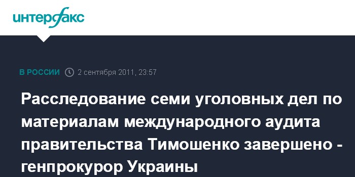 Киев. 2 сентября. ИНТЕРФАКС-УКРАИНА - Генеральный прокурор Украины Виктор Пшонка заявляет о завершении расследования семи уголовных дел, открытых по материалам международного аудита деятельности правительства Юлии Тимошенко.