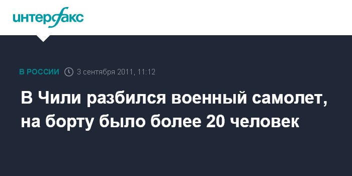 Сантьяго. 3 сентября. INTERFAX.RU - Военно-транспортный самолет Чили CASA-212 потерпел крушение в пятницу у островов Хуан-Фернандес, в южной части Тихого океана, сообщили представители чилийских ВВС. Лайнер исчез с радаров после того, как пилоты два раза пытались совершить посадку на одном из островов Хуан-Фернандес.