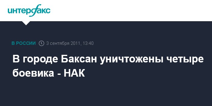 Москва. 3 сентября. INTERFAX.RU - В ходе контртеррористической операции, проводимой в городе Баксан (Кабардино-Балкария), уничтожены четыре бандита, сообщает Национальный антитеррористический комитет. "Два бандита уничтожены в ходе проведения мероприятий по зачистке близлежащих домов. Таким образом, на данное время ликвидированы четыре бандита", - заявил в субботу "Интерфаксу" официальный представитель НАК Николай Синцов.