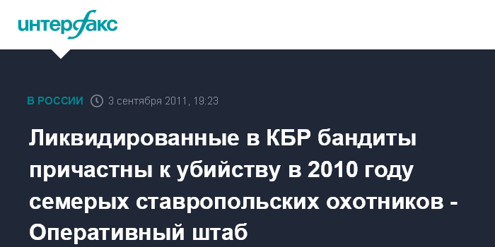 Тогда представитель следственного управления Следственного комитета РФ по Кабардино-Балкарии сообщал "Интерфаксу", что по предварительным данным, семерых охотников в Кабардино-Балкарии убили четверо неустановленных лиц, вооруженных двумя автоматами, пулеметом и пистолетом. Двум охотникам удалось вырваться из рук бандитов.