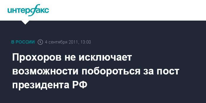Москва. 4 сентября. INTERFAX.RU - Лидер "Правого дела" Михаил Прохоров не исключает, что в случае успешного выступления партии на выборах в Госдуму он станет кандидатом в президенты РФ. "Если мы наберем 15% и станем второй партией в Госдуме, то такая партия обязана выставлять такого кандидата, и я свое имя не исключаю", - сказал М.Прохоров в воскресенье на встрече с журналистами.