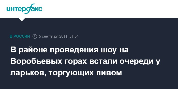 Москва. 5 сентября. INTERFAX.RU – После завершения лазерного шоу на Воробьевых горах десятки гуляющих горожан и гостей столицы, покинувшие место проведения мероприятия и пешком пытающиеся добрать до метро, выстраиваются в очереди у круглосуточных ларьков, торгующих пивом.