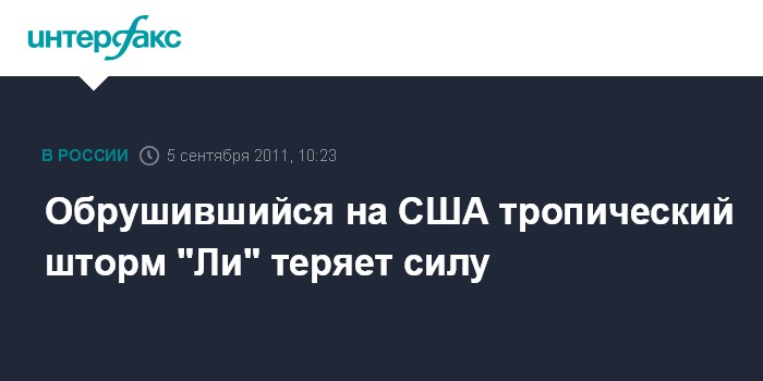 Вашингтон. 5 сентября. INTERFAX.RU - Добравшийся до США тропический шторм "Ли" ослаб до состояния тропической депрессии, сообщает национальный центр по наблюдению за ураганами США.