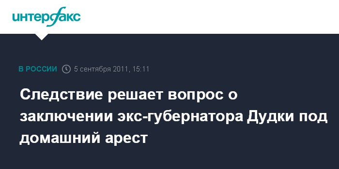 Москва. 5 сентября. INTERFAX.RU - Экс-губернатор Тульской области Вячеслав Дудка, который обвиняется в получении взятки, может быть взят под домашний арест, сообщил "Интерфаксу" в понедельник официальный представитель СК РФ Владимир Маркин.