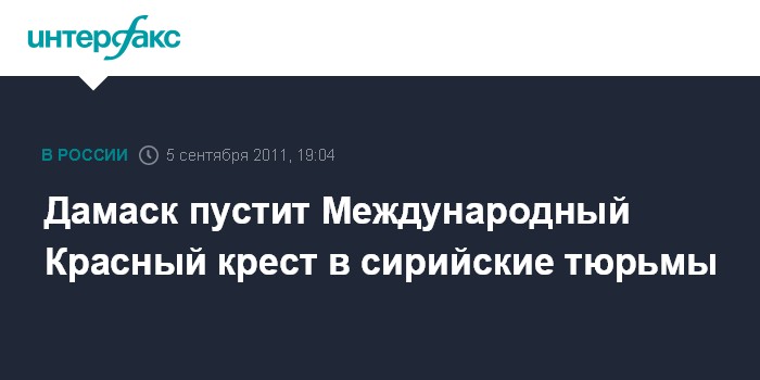 Женева. 5 сентября. INTERFAX.RU - Представители Международной организации красного Креста и Полумесяца (МОККП) впервые посетили центральную тюрьму в Дамаске, говорится в заявлении организации. "Сирийские власти впервые разрешили МОККП посетить тюрьму. Сначала нам разрешили осмотреть заключенных, арестованных министерством внутренних дел, но мы надеемся, что нам разрешат осмотреть всех заключенных", - заявил директор МОККП Якоб Келленбергер.