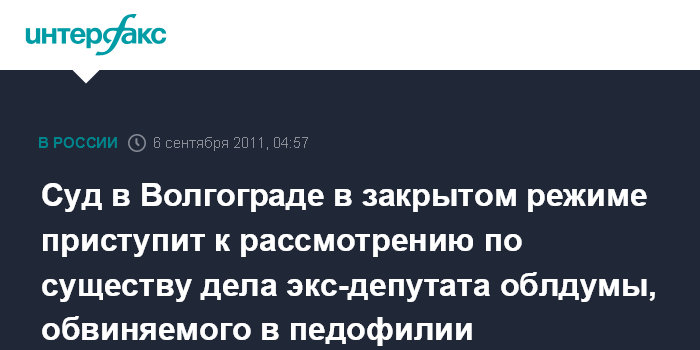 Волгоград. 6 сентября. ИНТЕРФАКС-ЮГ - Суд Дзержинского района Волгограда во вторник приступил к рассмотрению уголовного дела бывшего депутата Волгоградской областной думы Николая Волкова, обвиняемого в серии сексуальных преступлений в отношении детей.