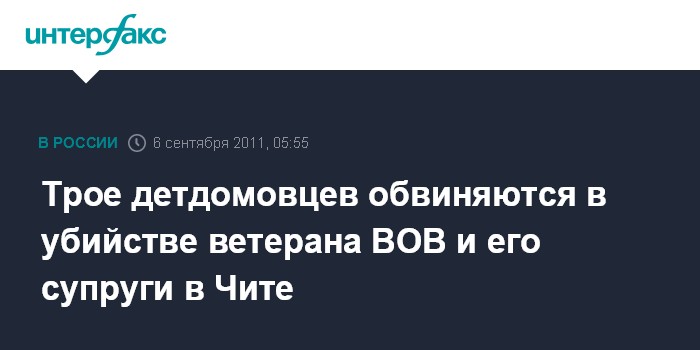Чита. 6 сентября. ИНТЕРАКС-СИБИРЬ - Железнодорожный отдел СУ СКР по Забайкальскому краю предъявил обвинение трем воспитанникам детдома, подозреваемым в разбое и убийстве ветерана Великой Отечественной войны и его жены, сообщает пресс-служба ведомства.