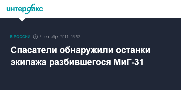 Москва. 6 сентября. INTERFAX.RU - Прибывшие на место катастрофы самолета МиГ-31 в Пермском крае оперативные группы спасателей обнаружили останки тел экипажа самолета, сообщил "Интерфаксу-АВН" начальник Управления пресс-службы и информации Минобороны РФ Игорь Конашенков.