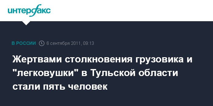 Москва. 6 сентября. INTERFAX.RU - Пять человек погибли в автокатастрофе в Тульской области, сообщили "Интерфаксу" в ГУ МЧС по Тульской области.