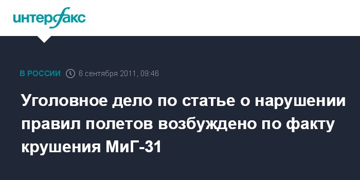 Москва. 6 сентября. INTERFAX.RU - Следственный комитет РФ возбудил уголовное дело по факту крушения самолета МиГ-31 в Пермском крае, сообщили "Интерфаксу" в СК РФ. Дело возбуждено по статье 351 УК РФ (нарушение правил полетов или подготовки к ним).