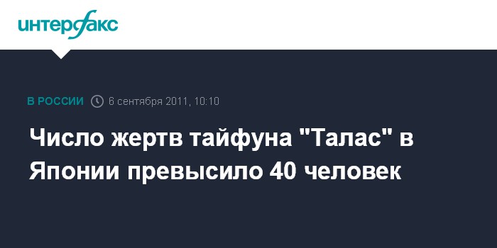 Токио. 6 сентября. INTERFAX.RU - Тайфун "Талас", прошедший на выходных по югу Японии, по последним данным, унес жизни минимум 41 человека, сообщают местные СМИ.