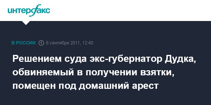 Москва. 6 сентября. INTERFAX.RU - Басманный суд Москвы вынес решение поместить под домашний арест бывшего губернатора Тульской области Вячеслава Дудку, обвиняемого в получении взятки в размере 40 млн рублей.
