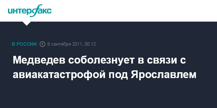 Москва. 8 сентября. ИНТЕРФАКС - Президент России Дмитрий Медведев выразил соболезнования в связи с авиакатастрофой под Ярославлем.
