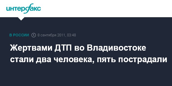 Владивосток. 8 сентября. ИНТЕРФАКС-ДАЛЬНИЙ ВОСТОК - Два автомобиля столкнулись в четверг утром в центре Владивостока, в результате аварии два человека погибли на месте, пять получили ранения, сообщил агентству "Интерфакс-Дальний Восток представитель отдела пропаганды ГИБДД города.