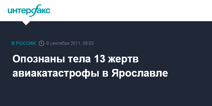Ярославль. 8 сентября. INTERFAX.RU - Опознаны тела 13 погибших, находившихся на борту самолета Як-42, разбившегося накануне под Ярославлем, сообщил журналистам замминистра транспорта РФ Валерий Окулов.