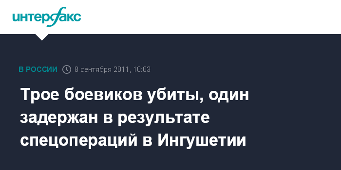 Москва/Назрань. 8 сентября. INTERFAX.RU - Трое боевиков ликвидированы, один задержан в четверг в Ингушетии, сообщил "Интерфаксу" официальный представитель Национального антитеррористического комитета (НАК) Николай Синцов.