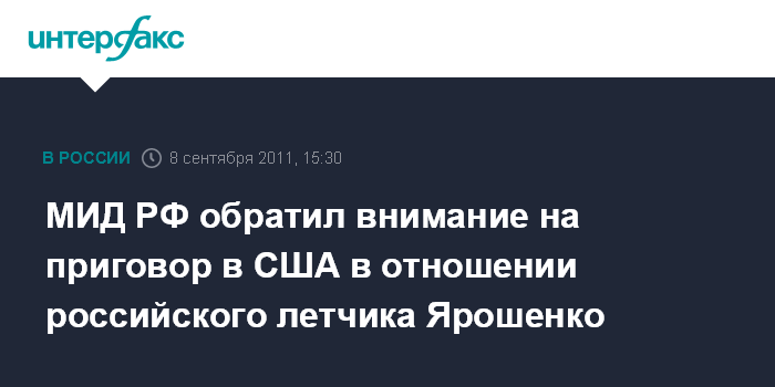 Москва. 8 сентября. INTERFAX.RU - Российский МИД обещает не оставить без реакции приговор американского суда гражданину РФ, летчику Константину Ярошенко, который приговорен к 20 годам за контрабанду кокаина.
