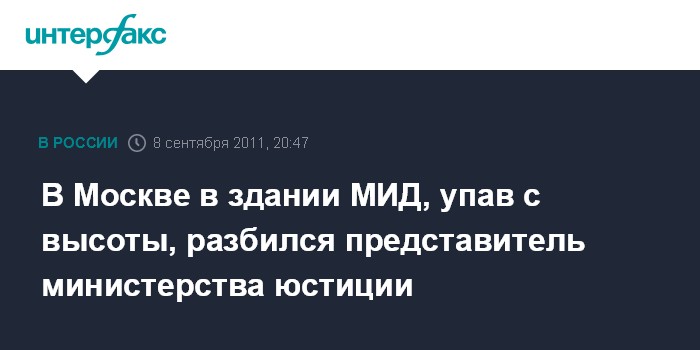 Москва. 8 сентября. INTERFAX.RU - В Москве в здании МИД, упав с высоты, разбился представитель министерства юстиции, сообщил "Интерфаксу" источник в правоохранительных органах.