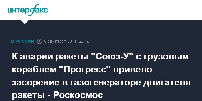 Москва. 8 сентября. ИНТЕРФАКС-АВН - К падению ракеты-носителя "Союз-У" с транспортным космическим кораблем "Прогресс М-12М " привело уменьшение расхода горючего в газогенераторе двигателя вследствие засорения тракта его подачи, сообщает пресс-служба Роскосмоса.