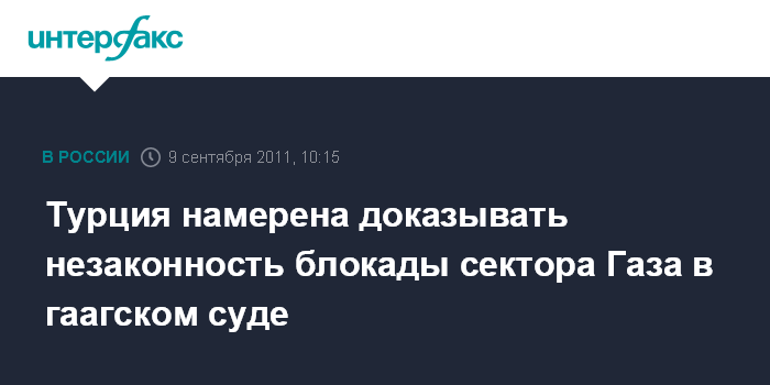 Ярославль. 9 сентября. INTERFAX.RU - Анкара обратится в Международный суд в Гааге за признанием незаконности израильской блокады сектора Газа, заявил президент Турции Абдулла Гюль.