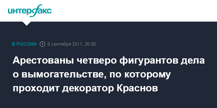Москва. 9 сентября. INTERFAX.RU - Останкинский суд Москвы в пятницу арестовал фигурантов дела о вымогательстве, в рамках которого подозревают художника-декоратора Бориса Краснова.