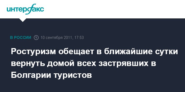 Москва. 10 сентября. INTERFAX.RU - Российские туристы, ставшие заложниками финансового конфликта в Болгарии между туроператором и авиаперевозчиком, вернутся на родину в ближайшие сутки, заверяют в Ростуризме. "По нашим данным, в Болгарии находится 900 российских туристов, которые из-за конфликта между туроператором "Алма-тур" и авиакомпанией "Булгариан эйр" не могут вернуться в Россию", - сообщил "Интерфаксу" в субботу вечером пресс-секретарь Федерального агентства по туризму (Ростуризм) Олег Мосеев.