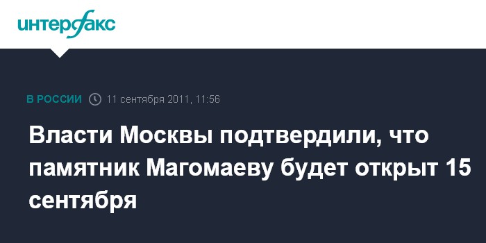Москва. 11 сентября. INTERFAX.RU - Торжественное открытие памятника народному артисту СССР, знаменитому певцу Муслиму Магомаеву в центре Москвы состоится 15 сентября в 13:00, сообщили "Интерфаксу" в департаменте культуры города. Там напомнили, что закладной камень на месте памятника в сквере на пересечении Елисеевского и Вознесенского переулков возле посольства Азербайджана был установлен 3 февраля 2010 года.